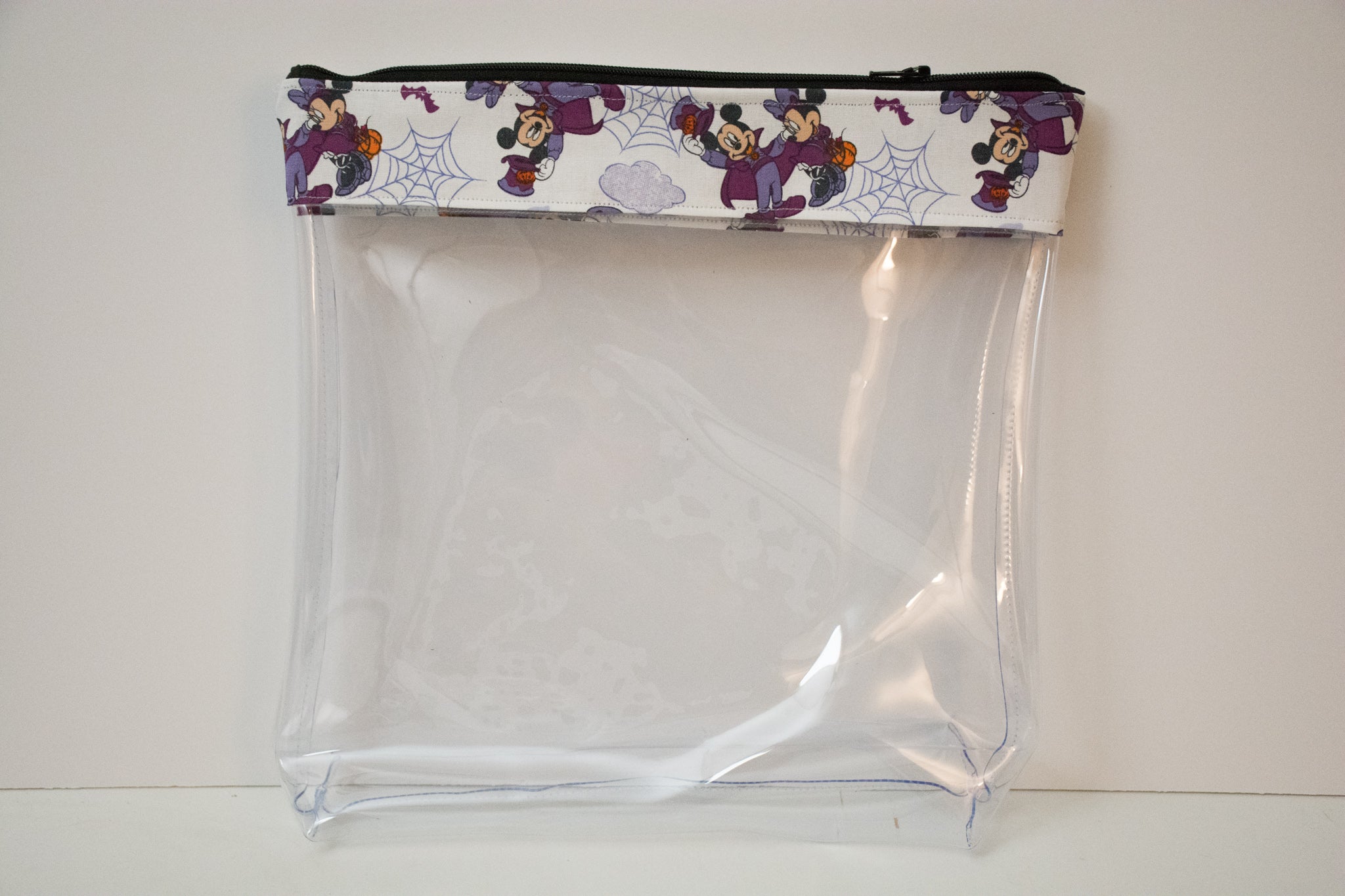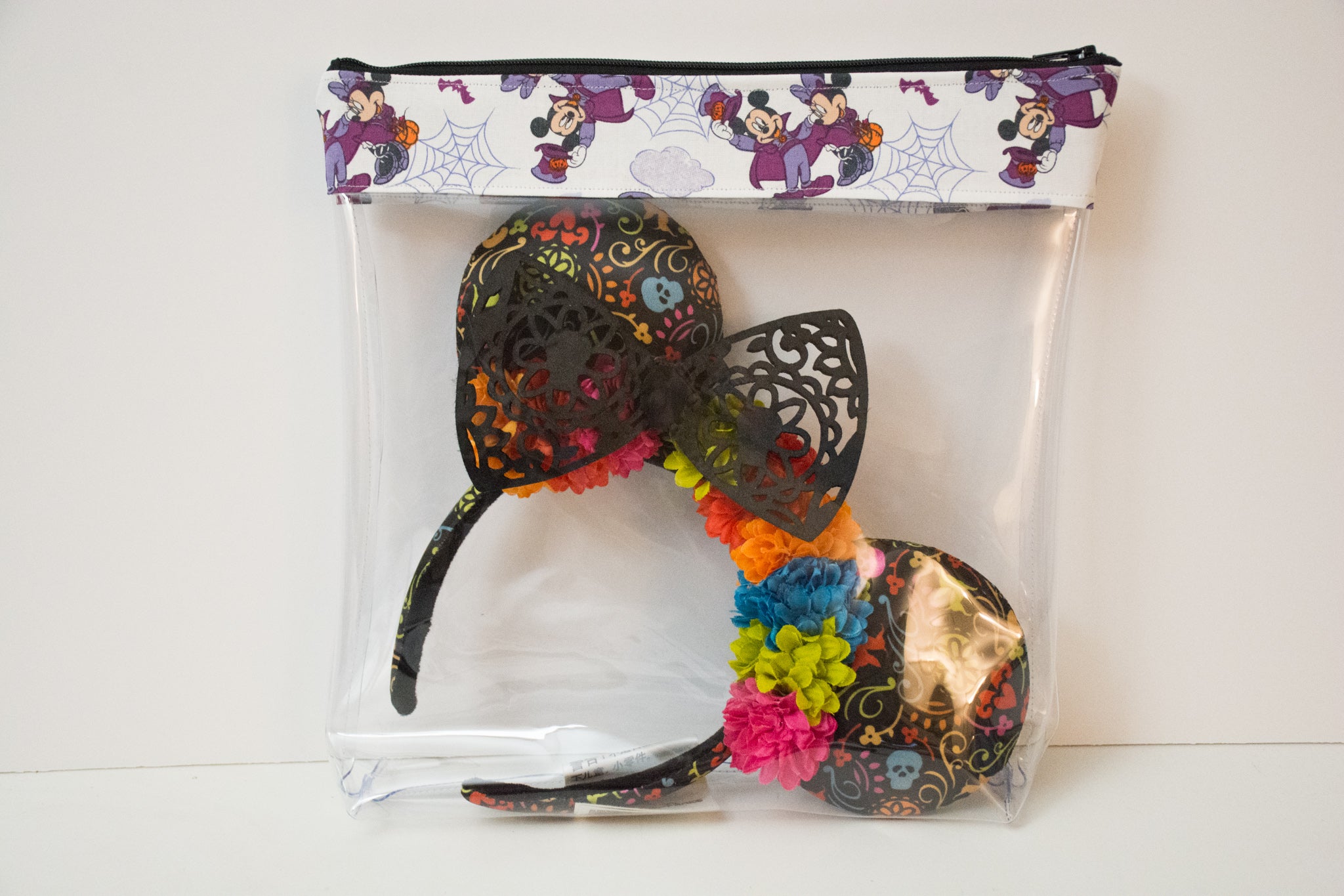 This ear bag is approximately 11x10,” which means it will be easy to stick into a carry on backpack or diaper bag.  The bag widens to about 2.75 inches from the bottom, which gives it a lot of flexibility to fit many style of ears. It can easily fit 2 DISNEY EARS, but you can possibly squish more in.  Going through security will be a breeze with these see through bags!